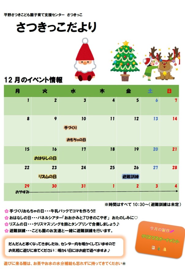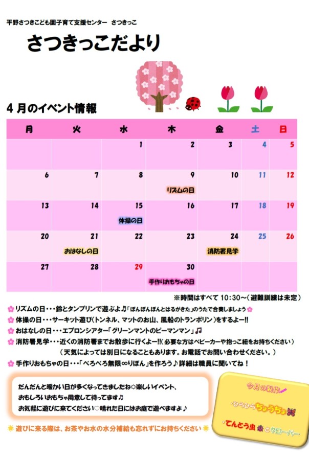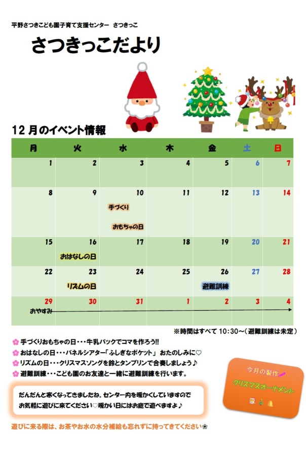 毎日、「うた♪」「絵本の読み聞かせ📖」「製作🖌」等の楽しい活動を企画しています。アットホームな空間で小さな赤ちゃんもゆったりと過ごせます♡一緒に子育てのお話をして楽しい時間を過ごしましょう♪イベントも毎月企画しています。お楽しみに♡お子さんの楽しめる場所、保護者の皆様のリラックスできる場になれば幸いです。
